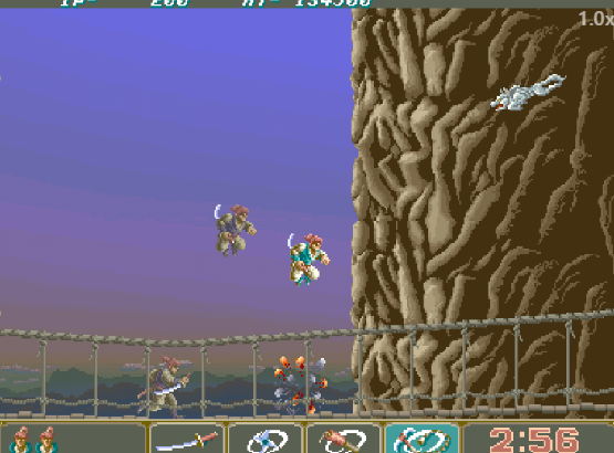 주인공/게임 특징 | 월영 (닌자), 분신술, 다양한 무기 시스템 개인적으로 필자가 어렸을때 예뮬레이터로 재미있게 했던 기억이 나고 현재도 많이 즐겨 하는 명작 중에 하나의 아케이드로 뽑히고 있음 Ninja Spirit 플레이방법: 횡스크롤 액션, 다양한 무기 사용, 분신술 활용;. 팁: 상황에 맞는 무기 선택, 분신 전략적 배치. 공략: 숨겨진 아이템 수집, 보스 패턴 파악. 무라마사(카타나), 우즈하(수리검), 라이타케(폭탄), 쇼류사이(사슬낫)등의 무기를 활용하여 악당들을 모두 제거하여 복수를 성공시키면 됨!! |