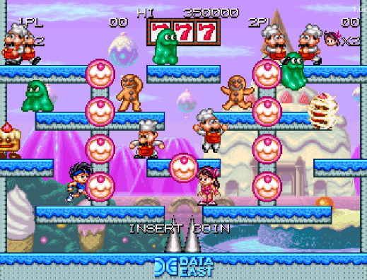 주인공/게임 특징 | 체육복 입은 십대 캐릭터, 다양한 파워업, 세계 지도 선택식 스테이지 Diet Go Go 플레이방법: 캐릭터로 점프하며 몬스터 공격, 뚱뚱해진 몬스터 튕겨 다른 몬스터 제거;. 팁: 파워업 아이템 활용, 음식 피하기. 공략: 보너스 라운드에서 구름 타고 보석 수집. 음식물을 던져 맞추는 방식으로 적들을 처치하는 형식임 연쇄 공격을 적에게 하면 적들을 이리저리 튕겨 나가면서 보다 쉽게 제거가 가능함!! |