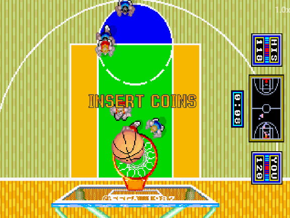 4명의 농구 선수, 탑뷰 시점, 테이블형 캐비닛이 지원되는 탑다운 뷰(top-down view) 게임