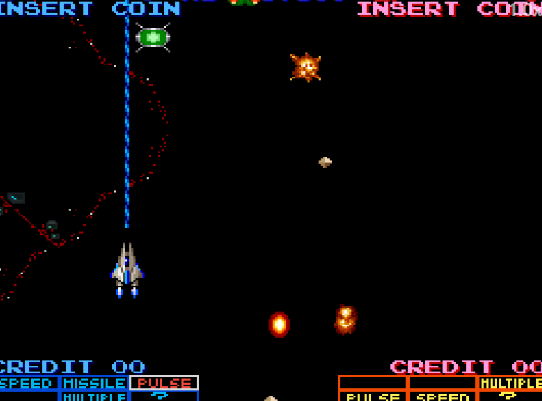 공략: 탄막 피하기, 보스 패턴 파악을 할 것. 미션 진행시에는 파워업 캡슐을 모아 원하는 무기를 활성화(미사일, 레이저, 실드 등) 옵션(분신)을 최대한 확보을 하고 수 많은 적들을 모두 제걸르 할 것.!