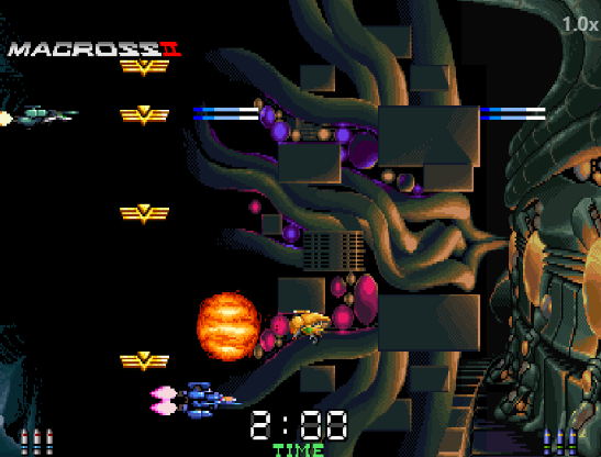 주인공/게임 특징 | 세르비, 넥스 (애니메이션 캐릭터), 3단 변형 발키리, 협력/대전 모드를 지원하고 있으며 스토리는 외계 종족 마르두크와 전투를 하면서 플레이 하는 슈팅게임, 초시공요새 마크로스 - 마크로스 II 플레이방법: 발키리 조종해 적 격파, 시간 내 점수 달성;. 팁: 아이템 활용, 변형 모드 전환. 공략: 히든 아이템 찾기, 보스 패턴 파악을 하고 적의 탄막을 잘 회피하여 최고의 점수 올릴것! |