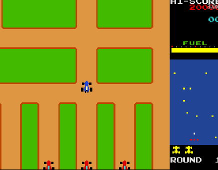 Rally-X 플레이방법: 미로에서 자동차 조종, 깃발 수집;.