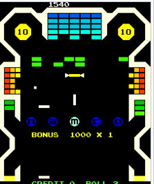 패들, 풀 컬러 디스플레이, NAMCO 글자 점등 보너스를 얻을 수 있으며 핀볼과 벽돌깨기가 장르가 혼합된 퍼즐게임이다.