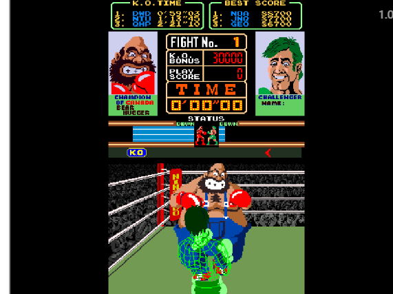주인공/게임 특징 | 와이어프레임 복서, 5명의 챔피언, 독특한 캐릭터 디자인, 인칭 시점 복싱 아케이드 작품으로 대결하는 상대의 공격하는 패턴을 먼저 잘 읽으며 공격을 회피하고 펀치를 피하고 케이오를 시키면 승리를 하게 되는 작품이다. 슈퍼 펀치-아웃!! 플레이방법: 조이스틱으로 펀치와 회피, 타이밍 맞춰 상대 공격;. 팁: 상대 패턴 파악, 카운터 펀치 활용. 공략: 스타 펀치 모으기, 적절한 회피 타이밍. 회피(Dodge) 또는 숙이기(Duck) 후, 약점 타격을 하고 적을 넉다운 시켜서 승리토록 하자!! |