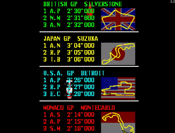 | 1989년 비디오 시스템이 1988년 F1 시즌을 모티브로 제작한 4개 서킷 기반 포뮬러 원 아케이드 레이싱 게임 | |
