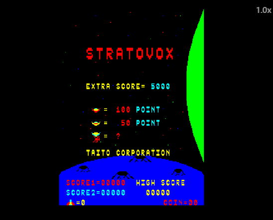 주인공/게임 특징 | 우주선으로 UFO를 전부 파괴를 하는 방식, 단순한 그래픽으로 구성됨, 역사상 초기 음성 합성(Voice Synthesis) 기술이 사용되여 큰 업적을 기록한 고정 화면 슈팅 게임 (Fixed Shooter, Invader-style)이다. Stratovox 플레이방법: 조이스틱으로 우주선 이동, 버튼으로 발사;. 팁: 적 패턴 파악, 음성 명령 주의. 공략: 화면 가장자리 활용, 적 우주선 빠르게 처치. 모든 우주 비행사가 납치되게 되면 게임종료되므로 유의해서 플레이를 할 것!!~ |