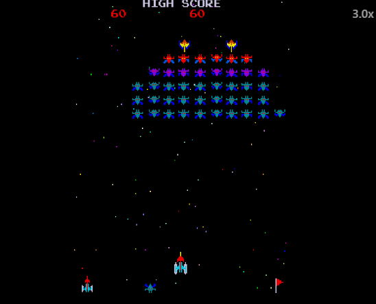 우주 전투기, 잠자리 모양 외계인들을 하단에 있는 비행선을 움직여 미사일을 발사하여 모든 적기들을 격추하여 가장 높은 스코어를 달성하며 됨.