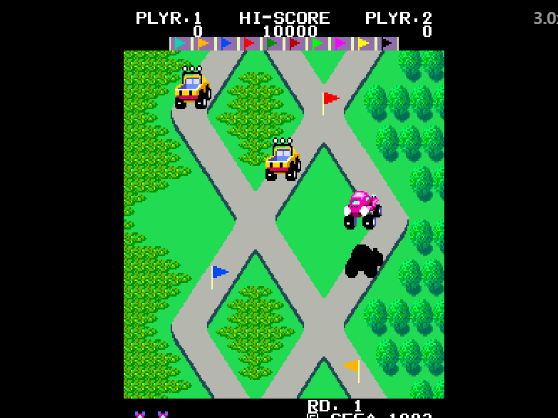 VW 비틀 차량, 3/4 뷰, 깃발 수집, 점프 기능 깃발 수집 임무를 진행하며 또한 점프 액션 요소가 결합된 종스크롤 레이싱장르의 재미가 최고인 게임이다.