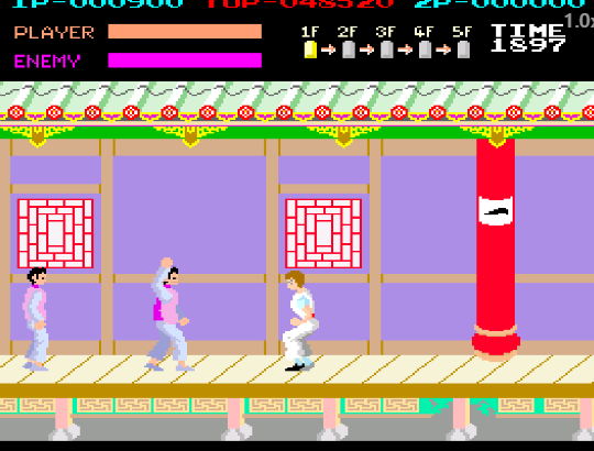 주인공/게임 특징 | 토마스(쿵후 마스터), 5층 구조, 다양한 적과 보스가 출연하고 있으며 납치된 사랑하는 연인을 위해서 적과 맞써 사우는 아케이드 격투 게임이다. 총 5개의 스테이지가 지원되며 다양한 쿵푸 기술을 적들을 제거할 것. Kung-Fu Master 플레이방법: 횡스크롤 액션, 5층 구조 클리어;. 팁: 적 패턴 파악, 시간 관리. 공략: 보스 약점 공략, 연속 공격 활용을 하고 적을 상대시 침착하게 타이밍공격으로 제압할 것! |