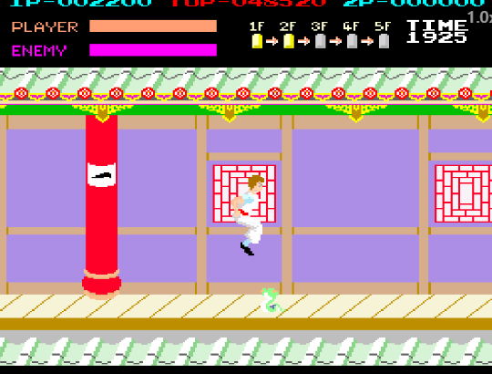 주인공/게임 특징 | 토마스라는 이름을 지닌 상당한 무술실력을 지닌 주인공을 컨트롤을 하여 수 많은 적들에게 무술을 사용해서 모두 제거하는 게임이다. 이 게임은 5개 층 구조로 되어 있으며 다양한 적과 보스가 있기 때문에 항상 주의하여 공격 및 방어를 하여 엔딩까지 도달을 해보자. |