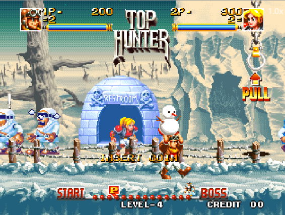 주인공/게임 특징 | 로디와 캐시 선택 가능, 다양한 무기 시스템, 남자와 여자 캐릭터와 함께 2인 협동 플레이이 지원하는 벨트스크롤 액션의 에스엔케이에서 제작한 게임이다. 탑 헌터 플레이방법: 조이스틱으로 이동, 버튼으로 공격 및 특수기;. 팁: 무기 변경 활용, 협동 플레이 시너지. 공략: 보스 패턴 파악, 콤보 기술 연습 할것, 플레이 할 때는 두개의 라인 시스템을 잘 활요을 하여야 하며 공격 및 회피를 동시에 하면서 특수기술을 사용하여 적들을 효과적으로 처치하면 되겠다. |