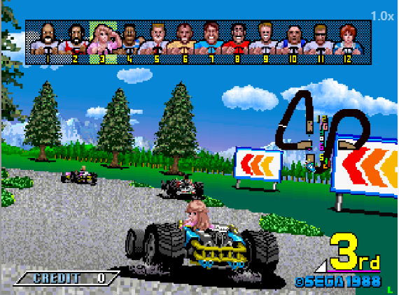 주인공/게임 특징 | 다양한 레이서, 25개 트랙, 점프와 다리, 애프터버너 제트기 특별 트랙이 제공되며 플레이를 할 때에 롤러코스터 같은 입체적인 코스 그리고 매우 부드러우면서 스피트감 있는 드리프트로 인해서 오래되었어도 상당한 명작의 작품이다. 레이스를 진행시에는 코스를 암기하고 드리프트로 코너를 잘 컨트롤을 하여 질주를 해보자! |
