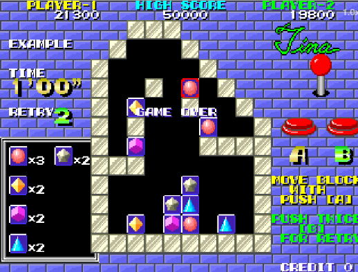 조작법 | 조이스틱 레버 (이동), 버튼 1개 (블록 잡기/놓기) |