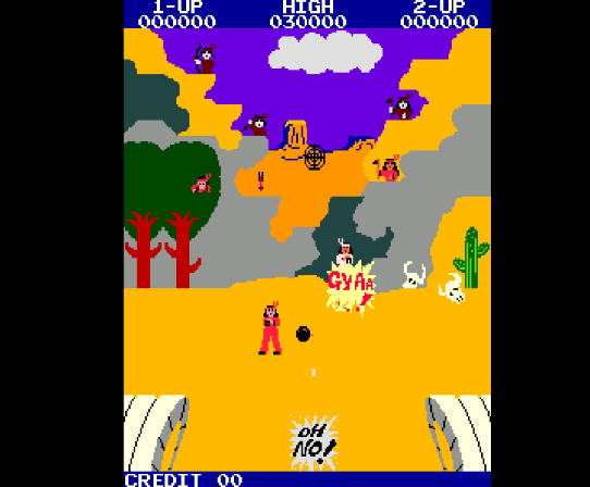 간단소개 | 과거 미국의 카우보이들이 설치고 다녔던 서부 시대를 배경으로 한 슈팅 게임이다. 특색 있는 악당(인디언, 카우보이, 멕시칸)들이 등장하며 해당 악등을 처치하며 점수를 획득하면서 미션을 수행하는 게임이다. |