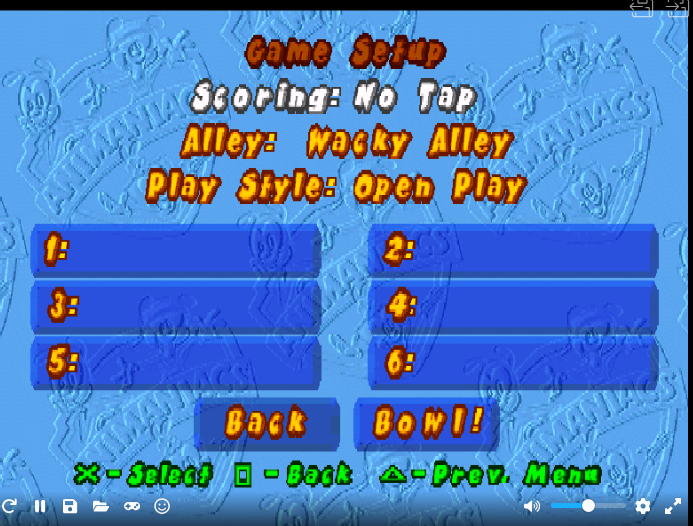 | 게임 간단소개 | 애니매니악스 캐릭터들과 볼링 경기를 즐기는 플레이스테이션1 콘솔버전으로 출시 된 3D 볼링 게임 |
